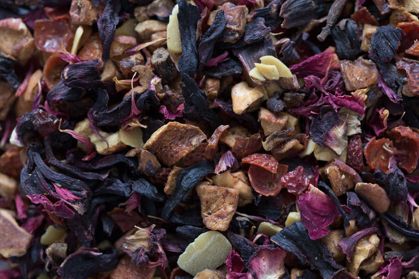 Pomme, hibiscus, amande, cynorhodon, zeste d’orange, rose, bleuet, clou de girofle, cardamome, vanille.