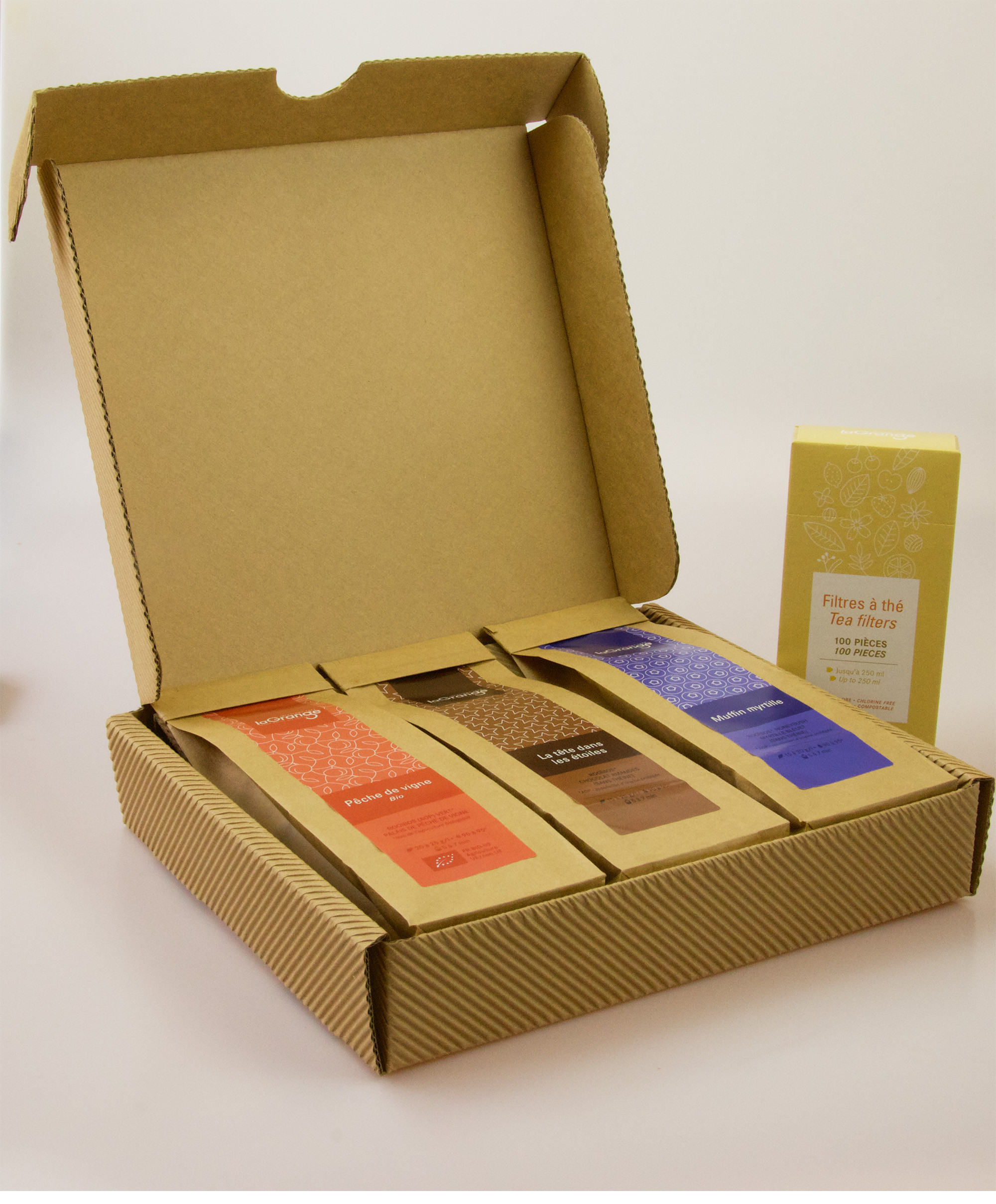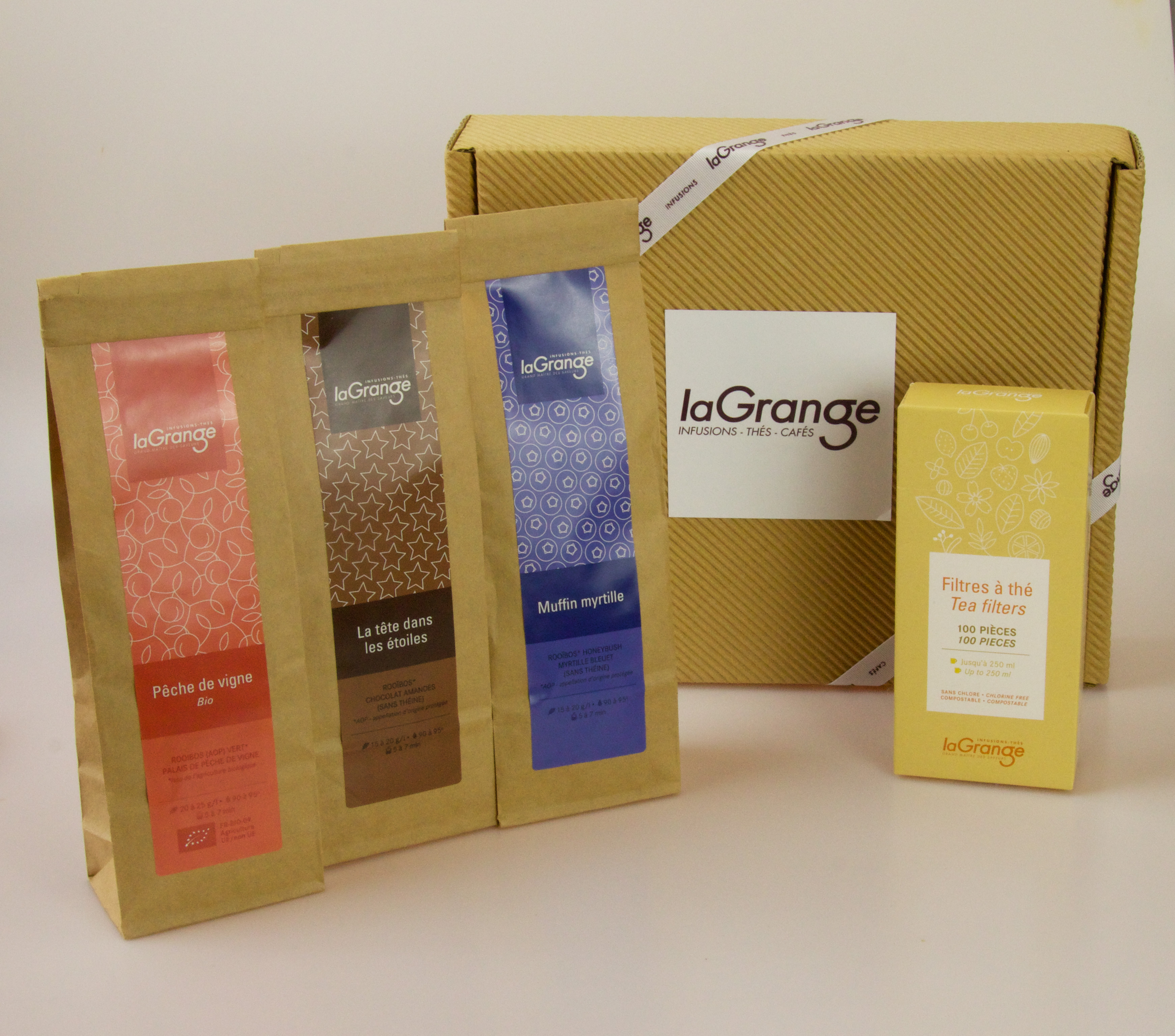 laGrange vous propose un coffret de 3 rooibos accompagnés d'une boîte de 100 filtres biodégradables, le tout livré prêt à offrir dans son joli écrin cadeau.