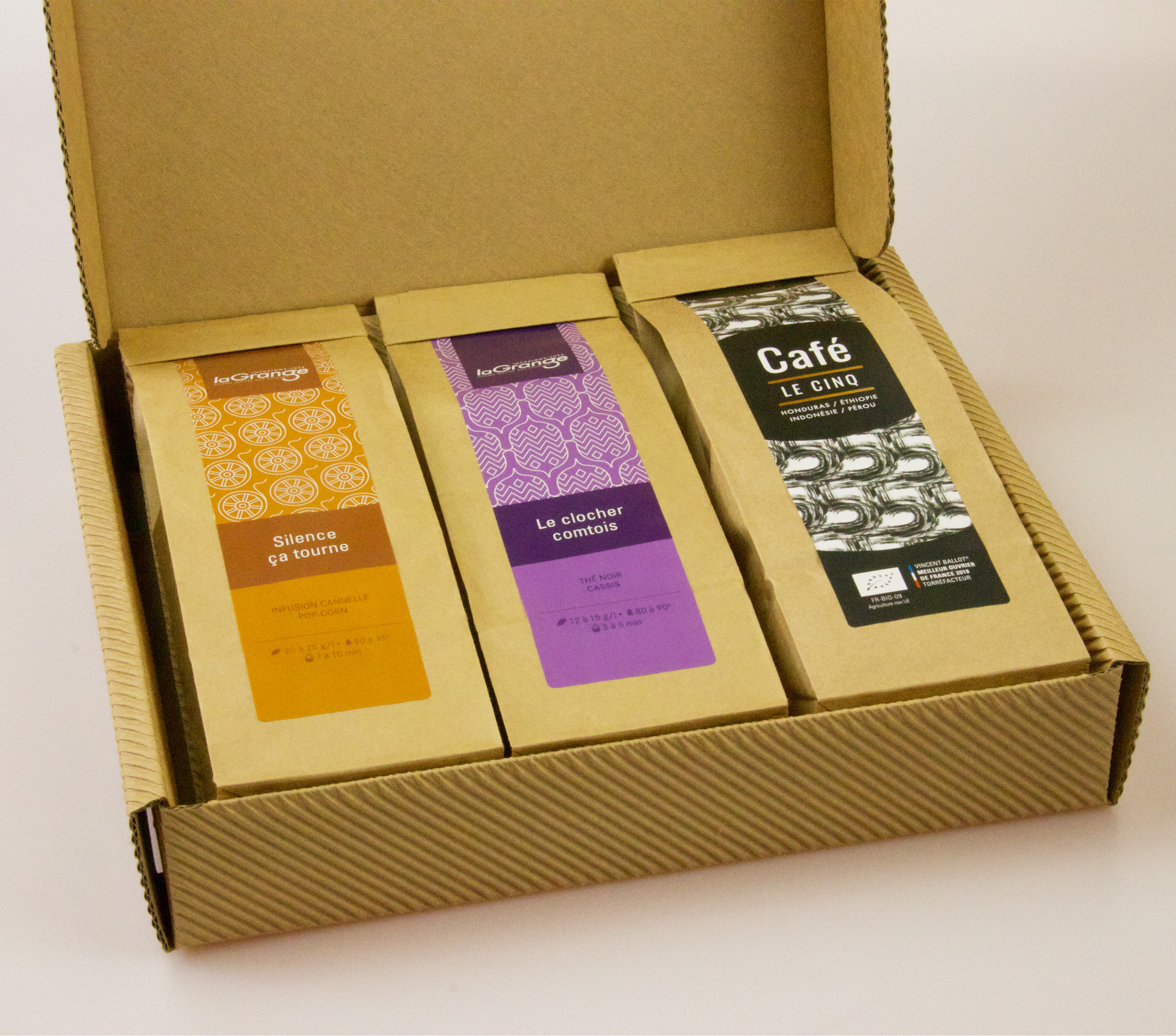 laGrange vous propose un coffret composé d'une infusion, d'un thé et d'un café, le tout livré prêt à offrir dans son joli écrin cadeau.