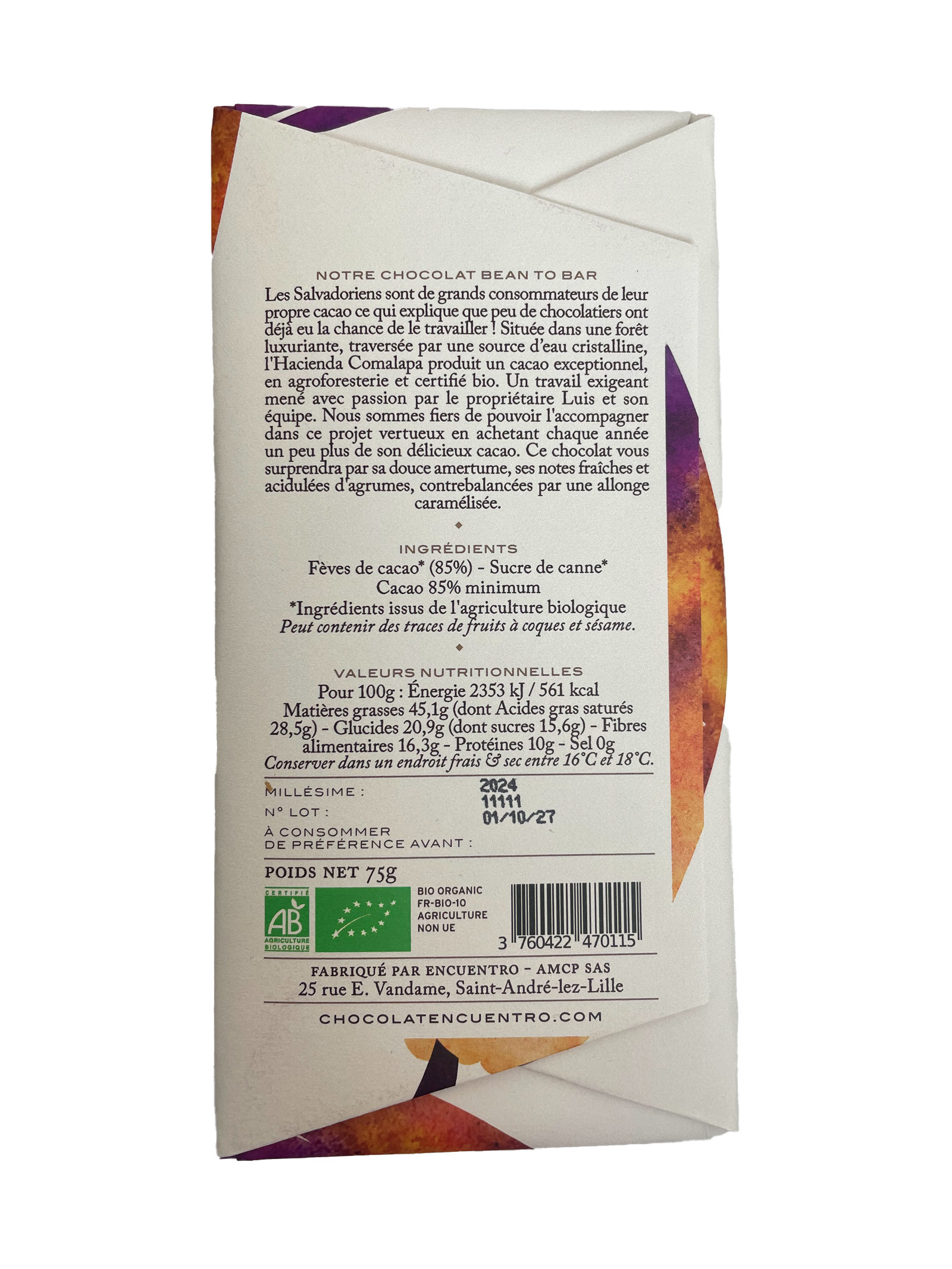 Tablette chocolat noir bio Encuentro : 75g de chocolat à 85%