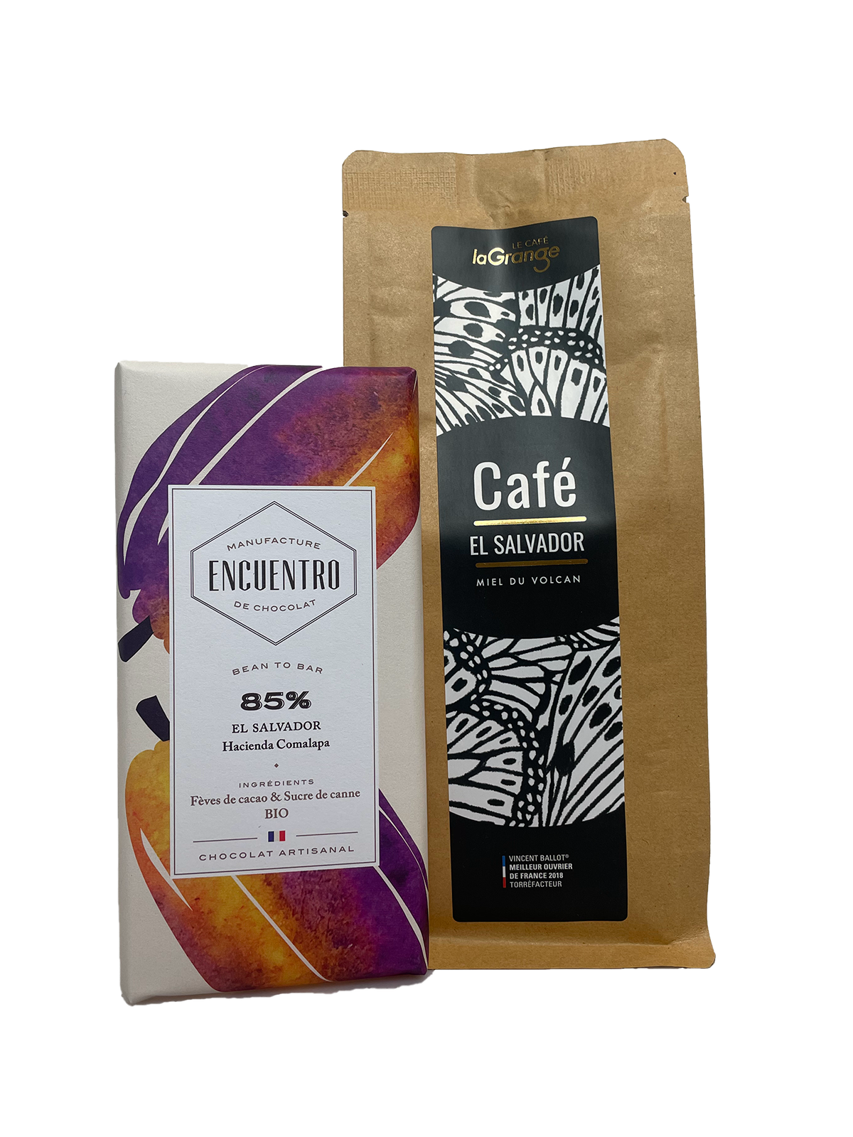Ce coffret réunit une tablette de chocolat noir 85 % bio Encuentro et un café en grain d’origine El Salvador laGrange, pour une expérience gourmande et authentique.