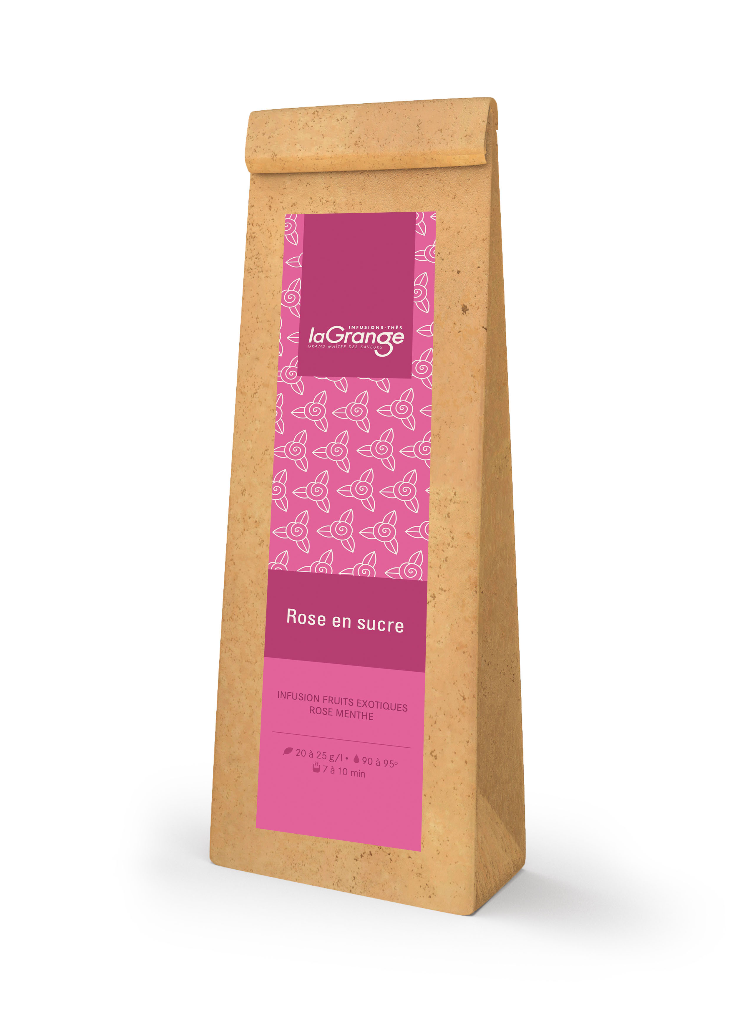 "Rose en sucre" est une infusion subtilement sucrée et rafraîchissante, alliant fruits exotiques, menthe fraîche et rose pour un voyage sensoriel de bien-être et de légèreté.