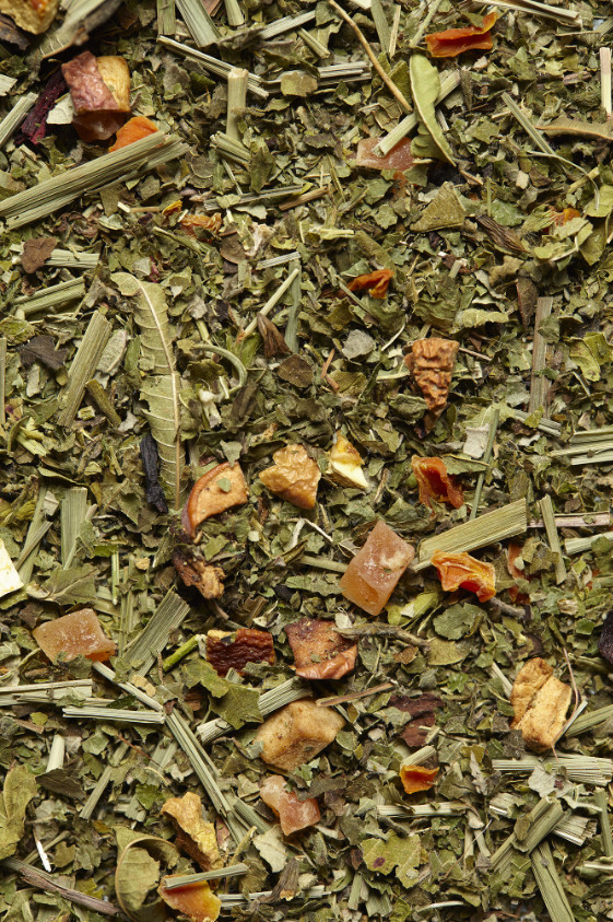 Feuilles de mûres, citronnelle, morceaux de pommes, flocons de carottes, morceaux de papayes (papayes, sucre), feuilles de mélisses, verveine, hibiscus, écorces d’oranges, arôme